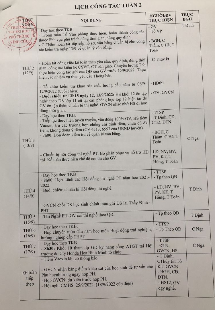 Lịch Công tác tuần 2 (12/9/2022 - 17/9/2022)
