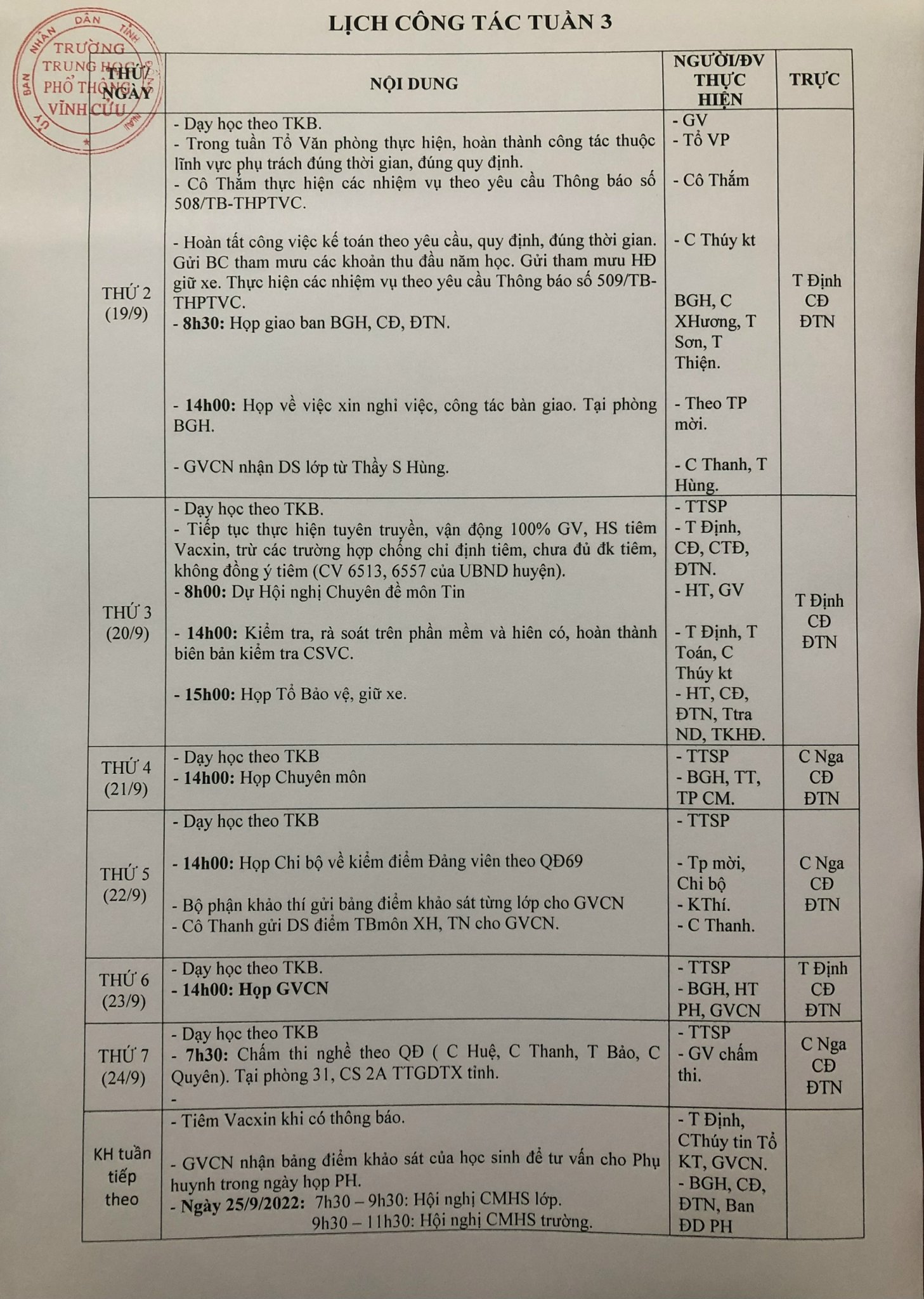 Lịch Công tác tuần 3 (19/9/2022 - 24/9/2022)