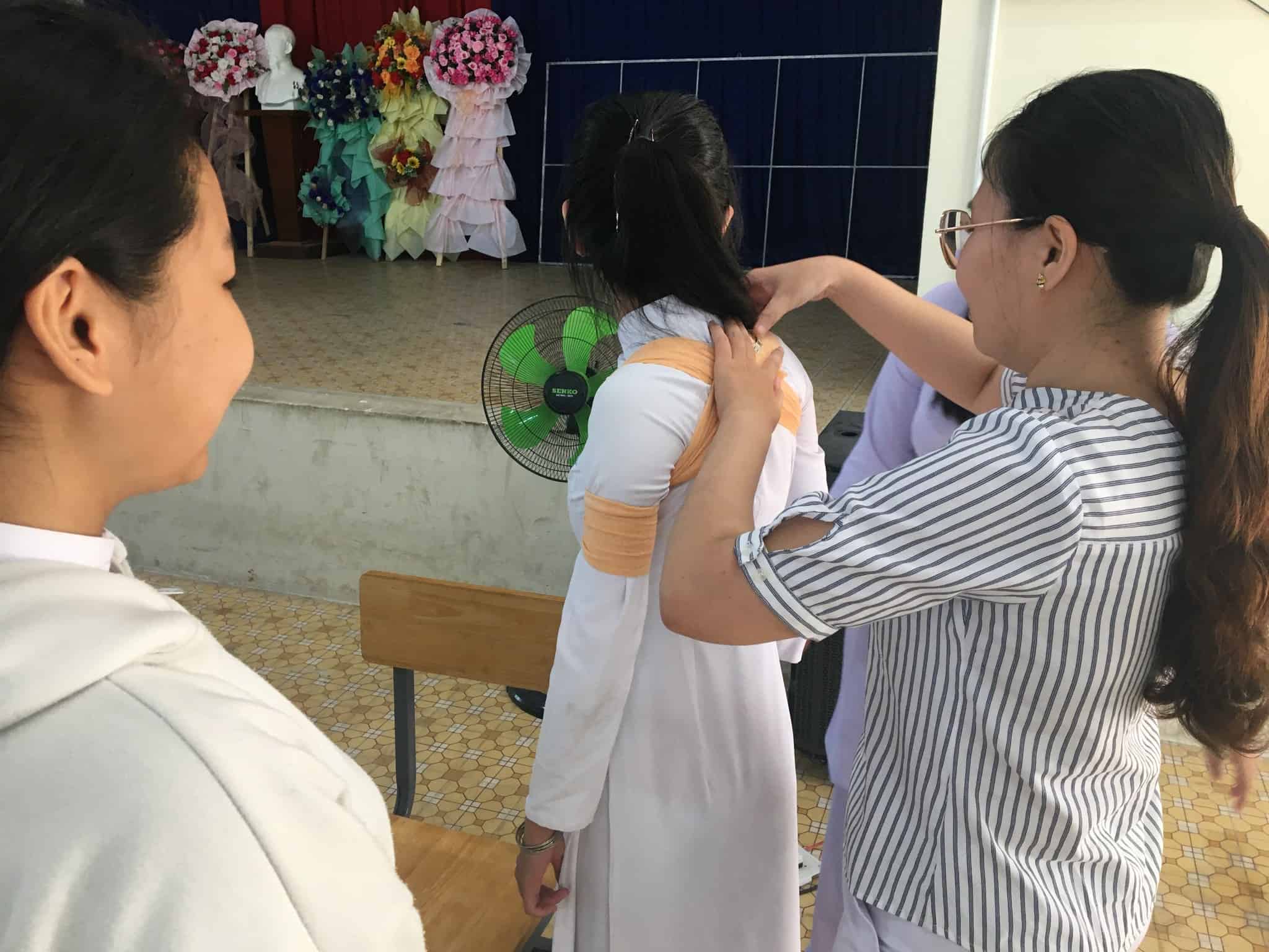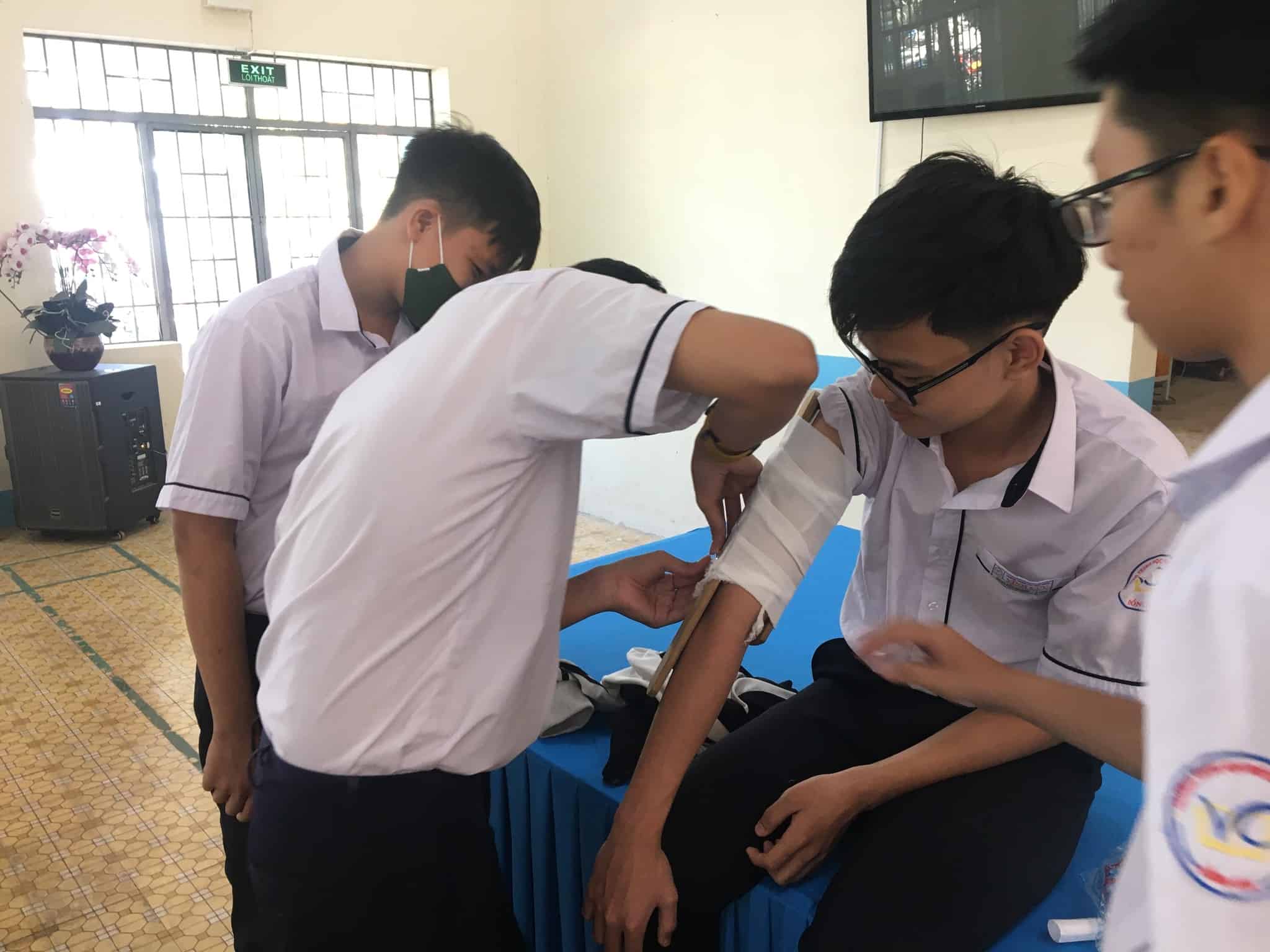 Dự buổi tập huấn có quý thầy cô trong Ban Giám hiệu nhà trường, Công đoàn, BCH Hội chữ thập đỏ trường và cán bộ y tế. Trưc tiếp tập huấn cho các em là cô Dương Thị Thùy Linh – cán bộ y tế trường.