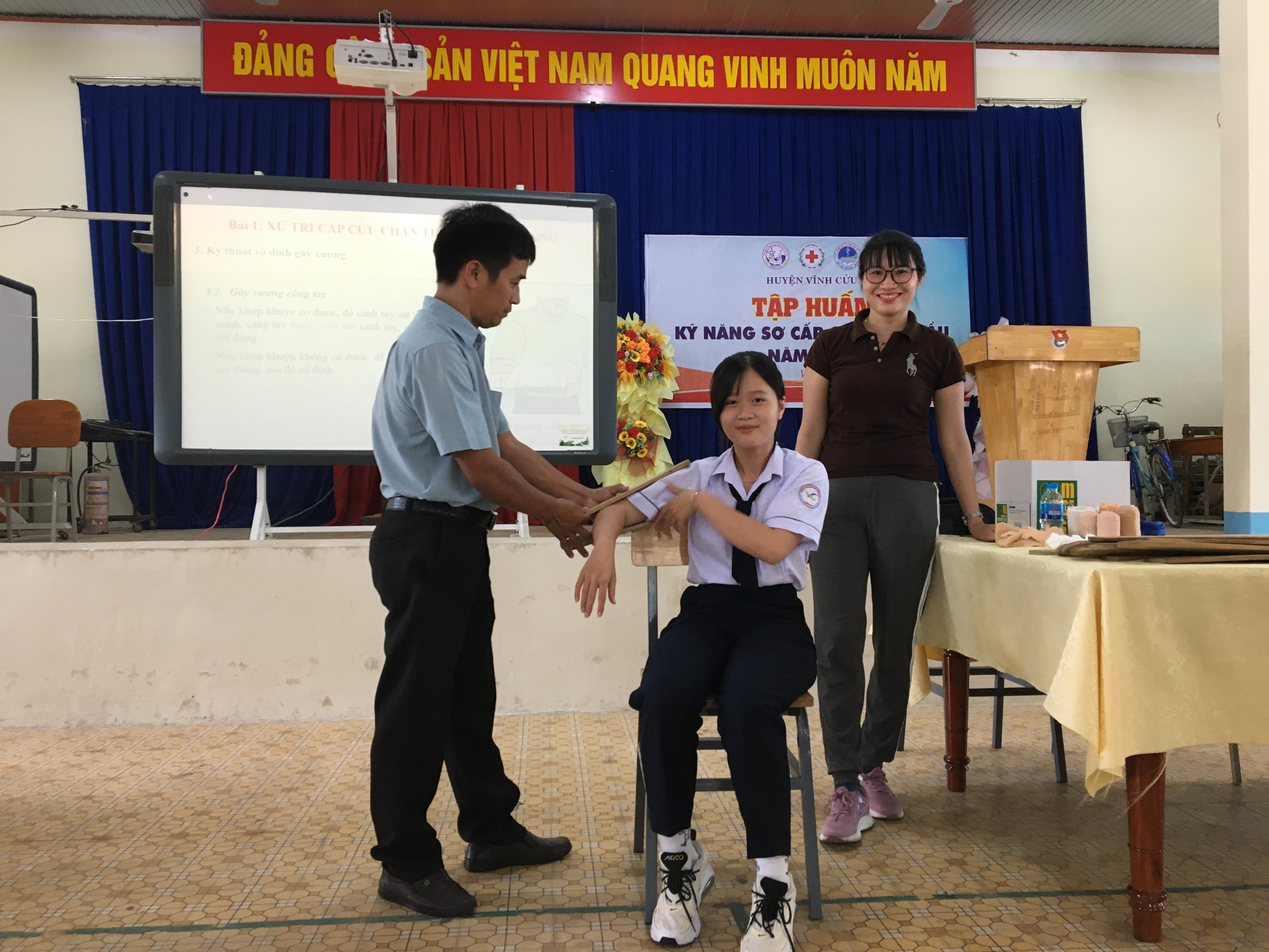 Sau khi học lý thuyết, các bạn ĐVTN học sinh được thực hành tại chỗ các thao tác cách băng bó các loại vết thương đầu, gãy tay, gãy chân,… cố định xương gãy. Một trong những hoạt động được nhà trường rất quan tâm đó là công tác huấn luyện sơ cấp cứu ban đầu cho cán bộ, người lao động, học sinh nhằm tạo lực lượng sơ cứu ban đầu với kiến thức vững chắc góp phần hỗ trợ cho công tác an toàn trong trường học.