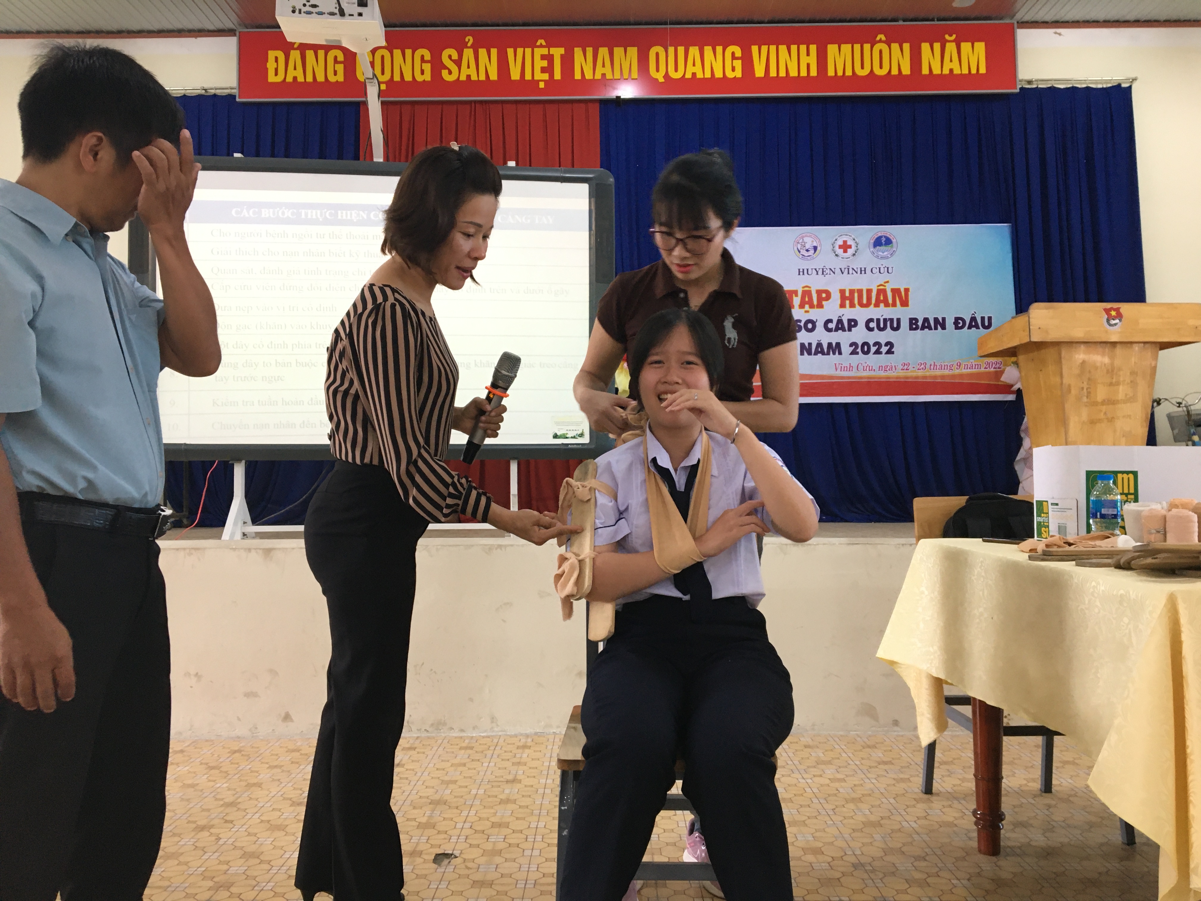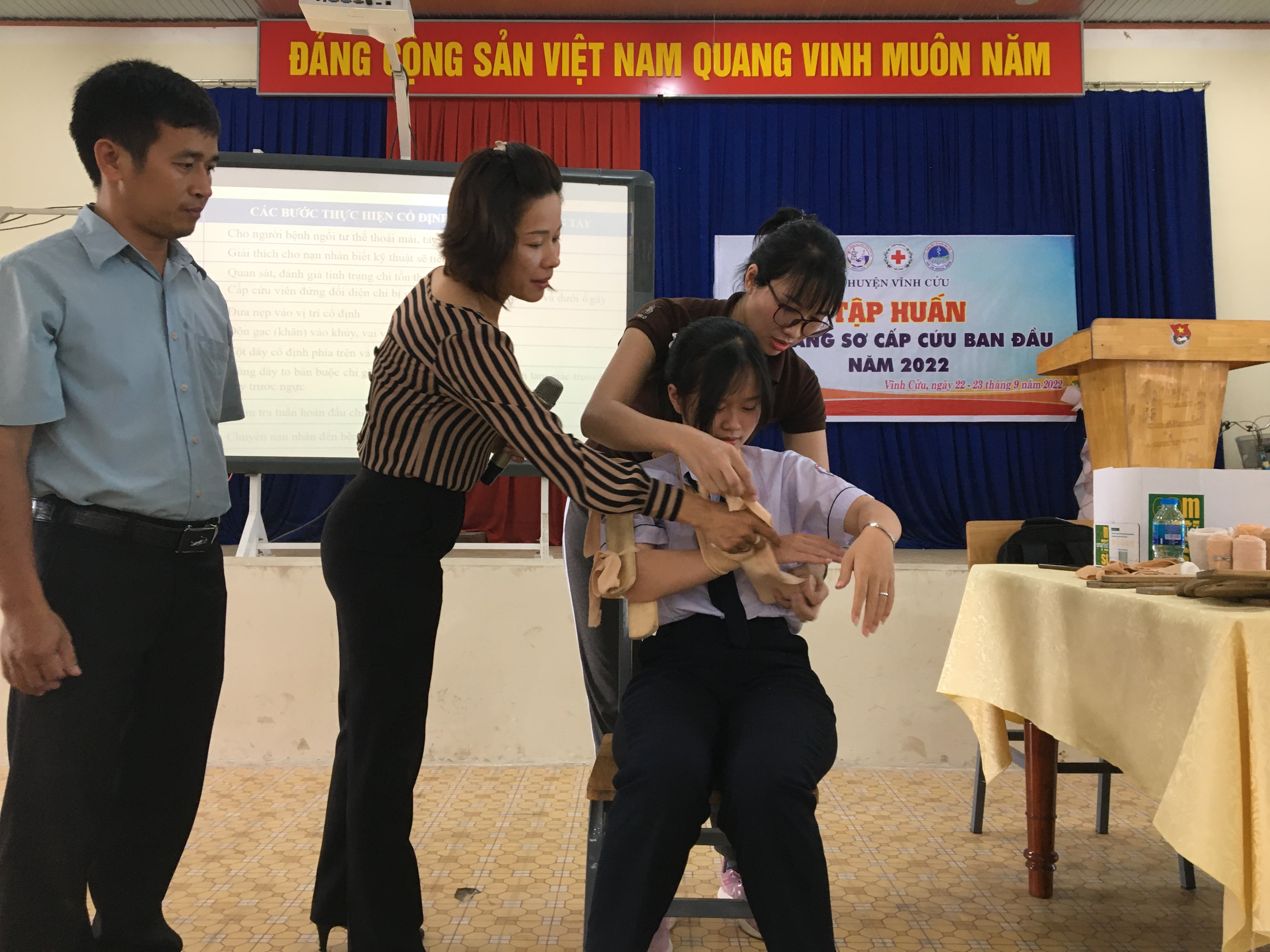 Thực hiện Công văn số 109/CTĐĐNa-PT ngày 22/8/2022 của Hội Chữ thập đỏ tỉnh Đồng Nai về việc hướng dẫn tổ chức hoạt động hưởng ứng ngày Sơ cấp cứu thế giới năm 2022. Trong 2 ngày 22 và 23/9/2022, tại trường THPT Vĩnh Cừu Hội CTĐ huyện phối hợp với Trung Tâm Y Tế huyện và Hội CTĐ, Đoàn Trường THPT Vĩnh Cửu tổ chức lớp tập huấn Sơ cấp cứu năm 2022 cho đối tượng là cán bộ, tình nguyện viên Chữ Thập đỏ xã Tân An, Thiện Tân, Thạnh Phú, Tân Bình, Bình Lợi, Bình Hòa và thầy cô, ĐVTN học sinh đang học tập tại trường.