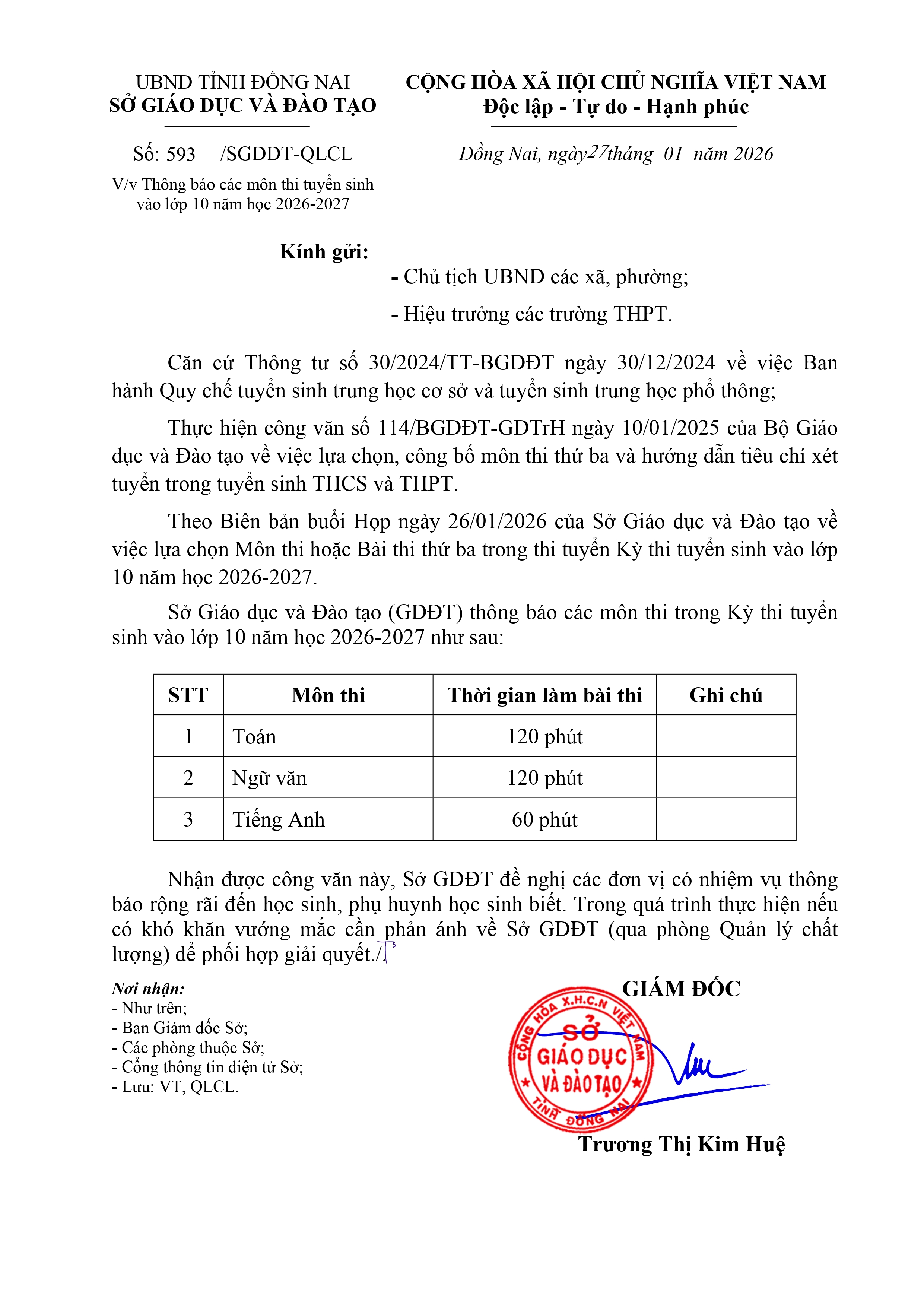 Thông báo các môn thi tuyển sinh vào lớp 10 năm học 2026-2027