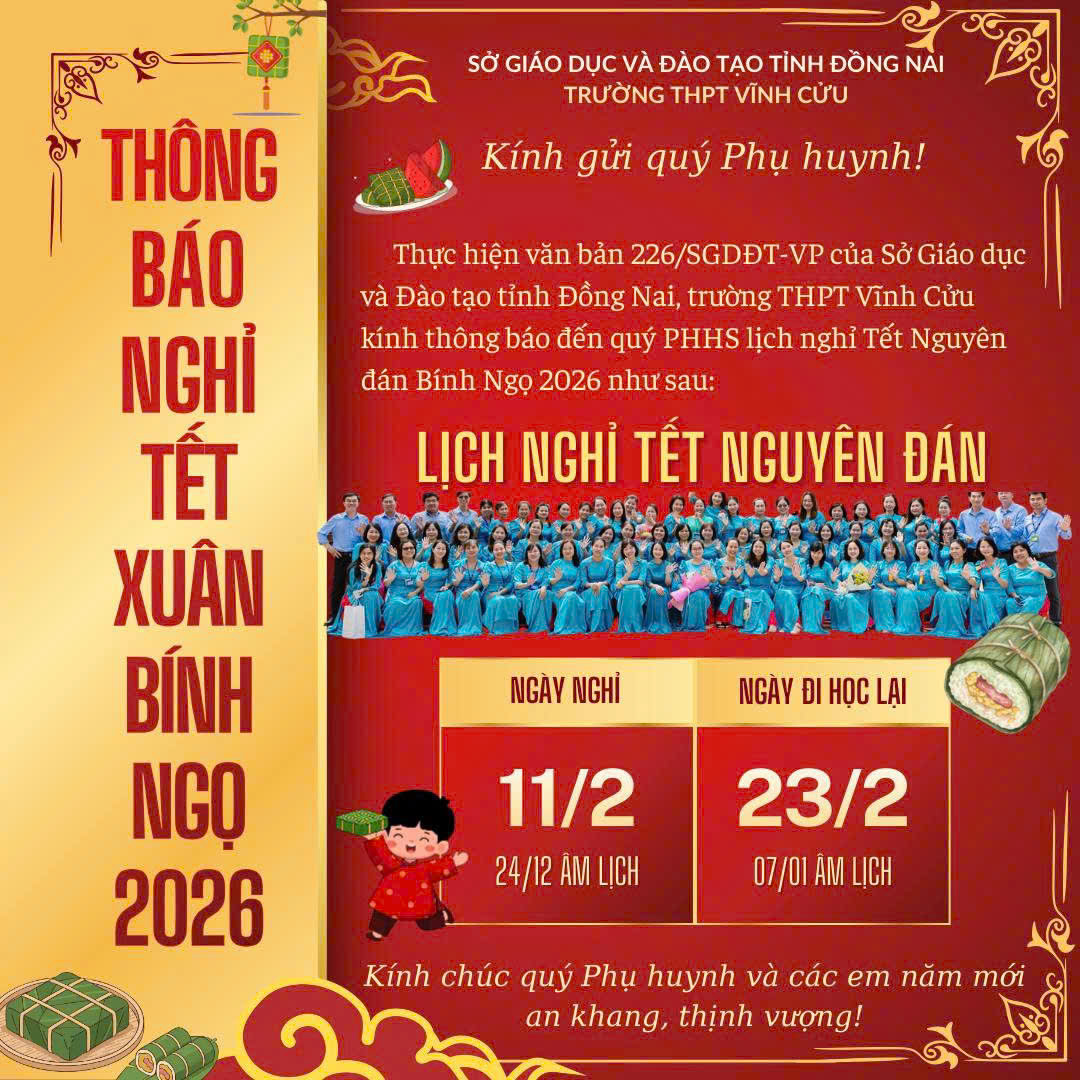 Trường THPT Vĩnh Cửu kính chúc quý thầy cô và các em học sinh một kỳ nghỉ Tết an lành, vui tươi và ý nghĩa bên gia đình.